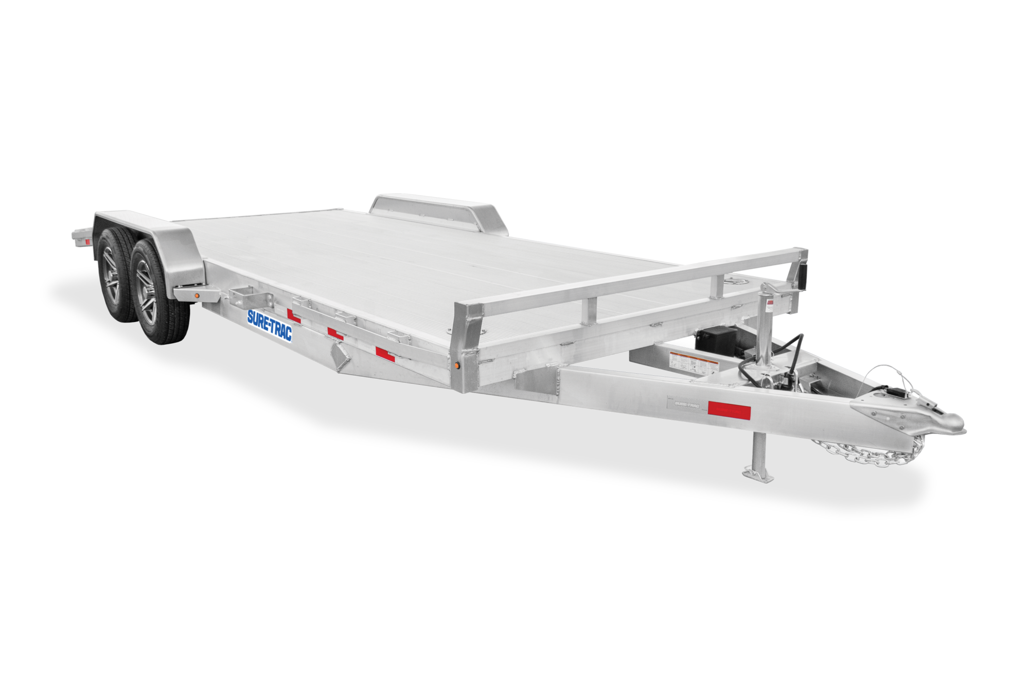 The Sure-Trac Aluminum Car Hauler is a stunning trailer that combines sleek aesthetics with exceptional performance. Its aluminum extruded deck not only adds a modern touch but also provides a lightweight and durable platform for your vehicle.